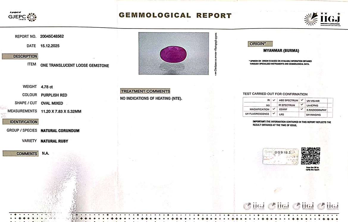 Origins: Myanmar Burma Treatment: Unheated and Untreated (No Indications Observed)colour: Purplish RedShape: Oval