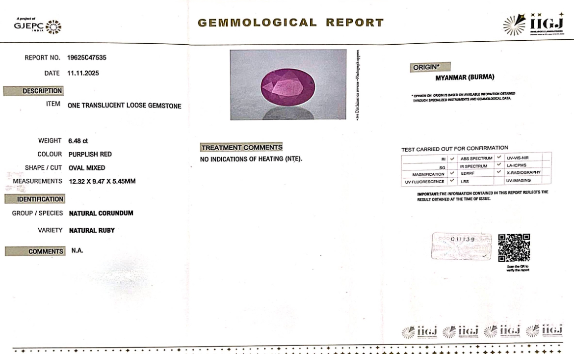 Origins: Myanmar Burma Treatment: Unheated and Untreated (No Indications Observed)colour: Purplish RedShape: Oval